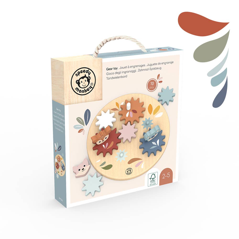 Includes 7 colourful wooden gear pieces that spin in sequence 3 cute animal blocks Crafted from FSC® certified wood Suitable for ages 2-5