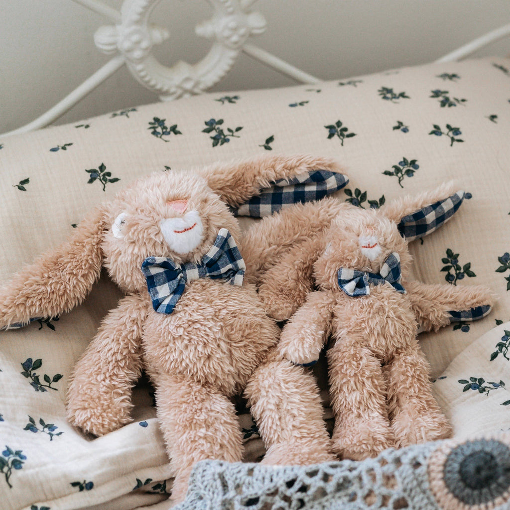 Louis rabbit is made with caramel super soft plush fabric and is wears an elegant blue gingham bow tie and finished off with blue gingham detail on his ears, hands and feet.