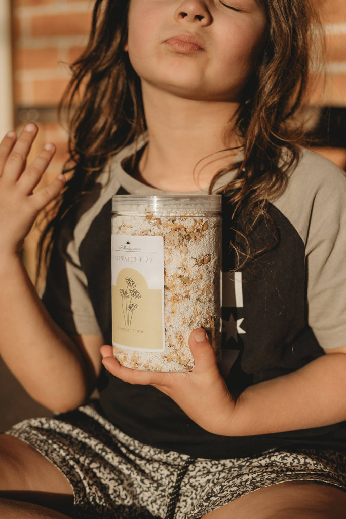 Sunshine Saltwater Fizz 800g Scented with Essential Oils An calming white fizz mixed with delightful yellow chamomile and calendula flowers and rock salt, for potion play. Just add water! ______ There is something so magical about adding little bits and pieces to a bowl, gems, flowers and glitter, sprinkling in some magic fizzy dust, making a secret wish and adding that special ingredient... water. Watching the delight on your child's face as their potion activates is such a special moment. When they are finished making their potion, bottle it up to keep and their wish will stay with them forever. How To Play Just add water!! That’s it!
