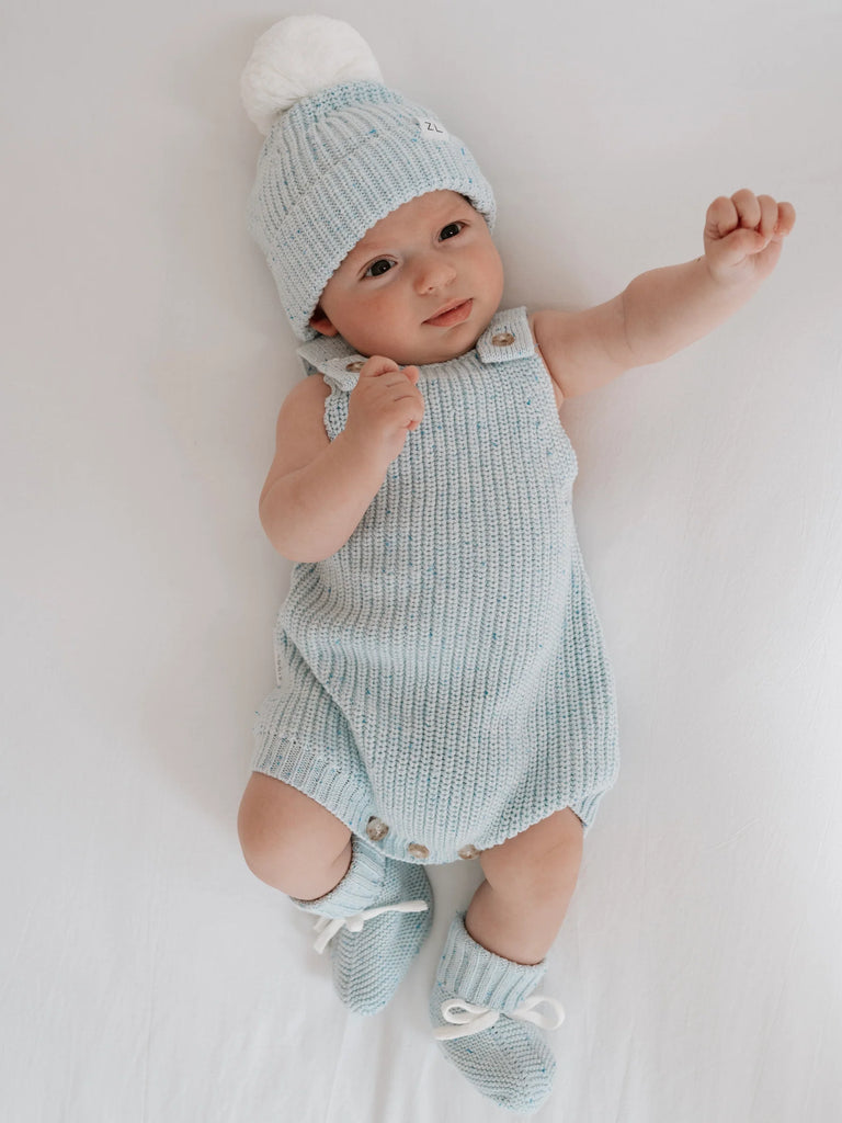 Knitted booties in our custom dyed Aero Fleck. Functional drawstring to ensure booties don't fall off when worn. Mix and match with items from our Aero Fleck Signatures Collection.