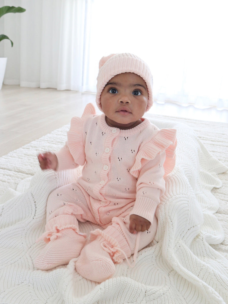 A beautiful knitted romper in our Primrose colour featuring a gorgeous pointelle detail and shoulder frill. Functional snaps at crotch for easy nappy changes. Mix and match with items from our Primrose Signature Collection for the perfect outfit.