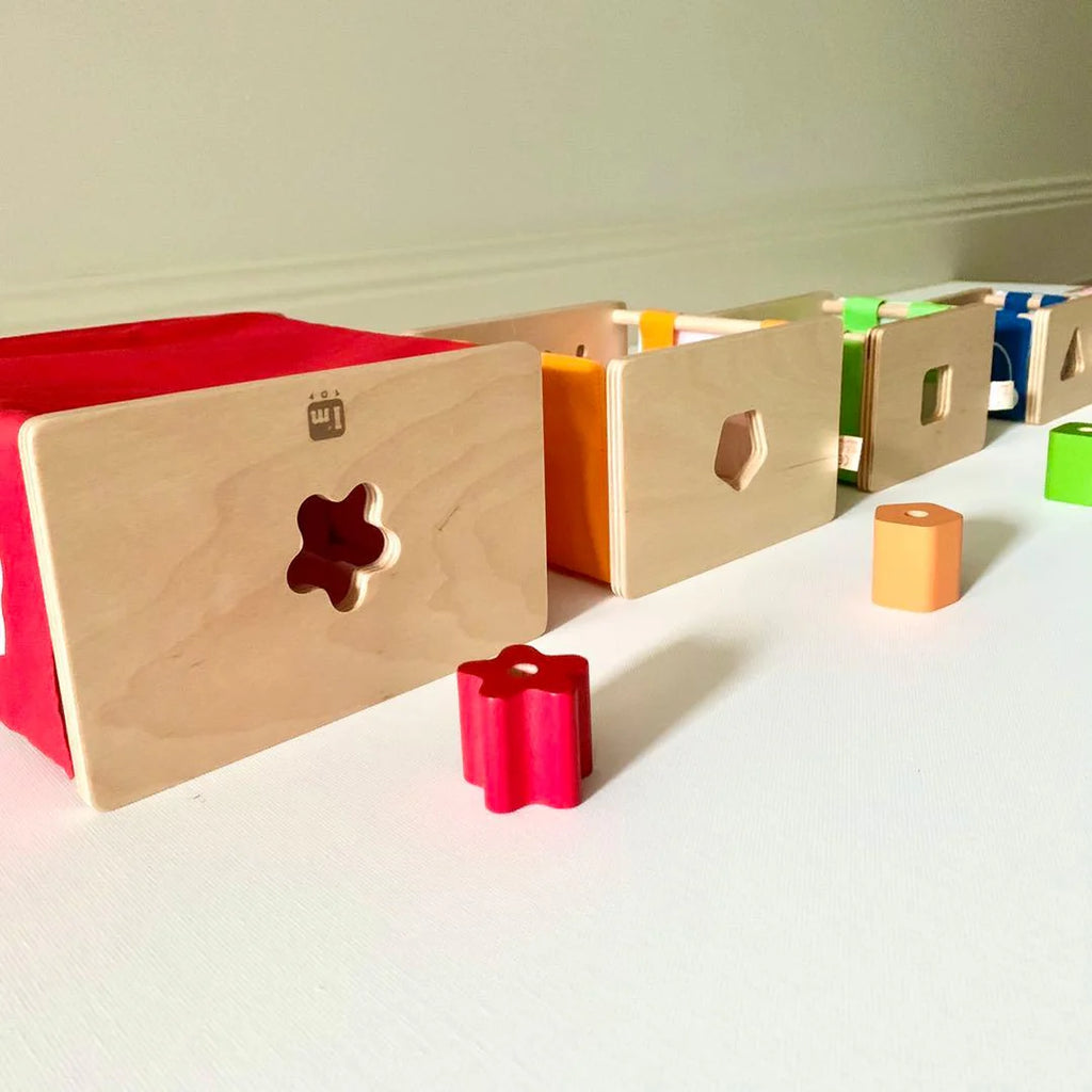 The best multi-use learning and activity toy we've seen! Features five sequential-sized wood and fabric boxes. Children can play: