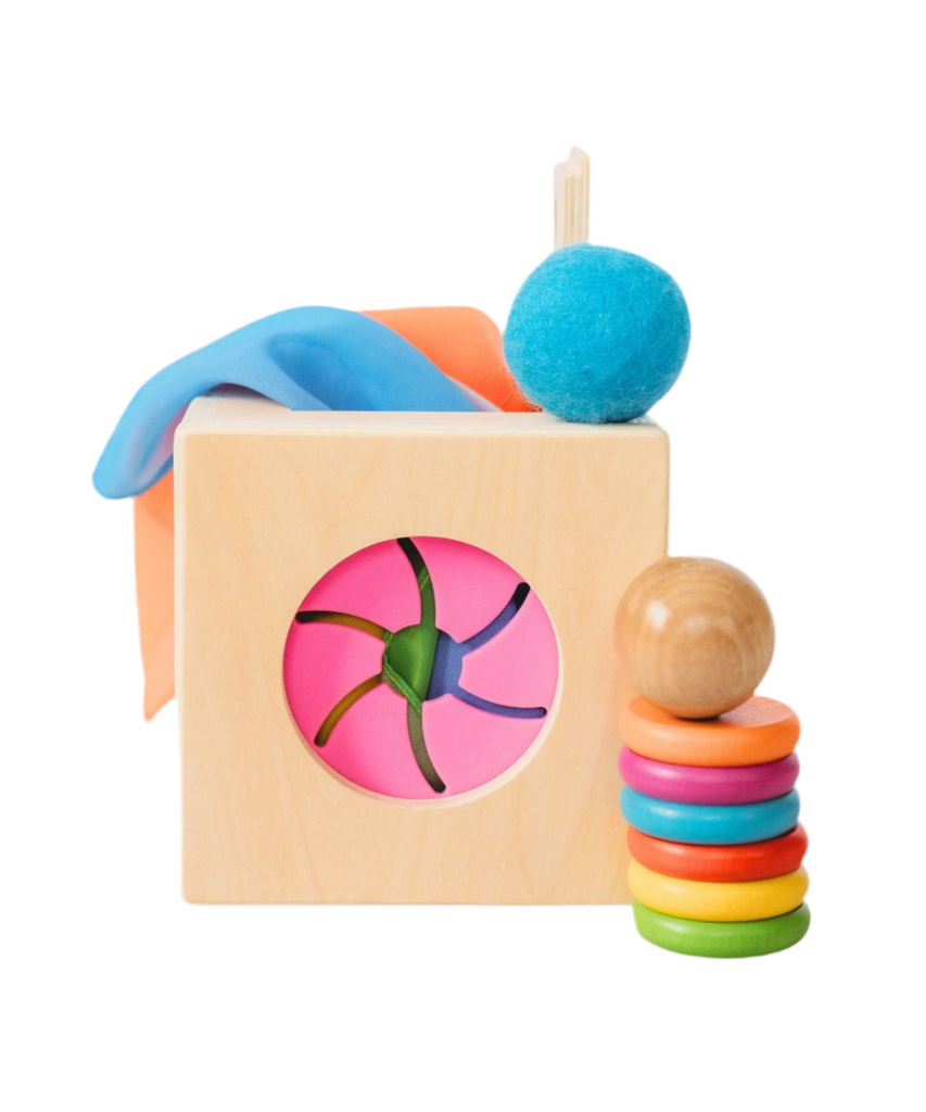 Crafted with safe, sustainable, and durable materials, the Totli Box comes complete with three colourful scarves, six stackable rainbow coins, and two sensory balls. Designed to grow with each child's developmental journey.