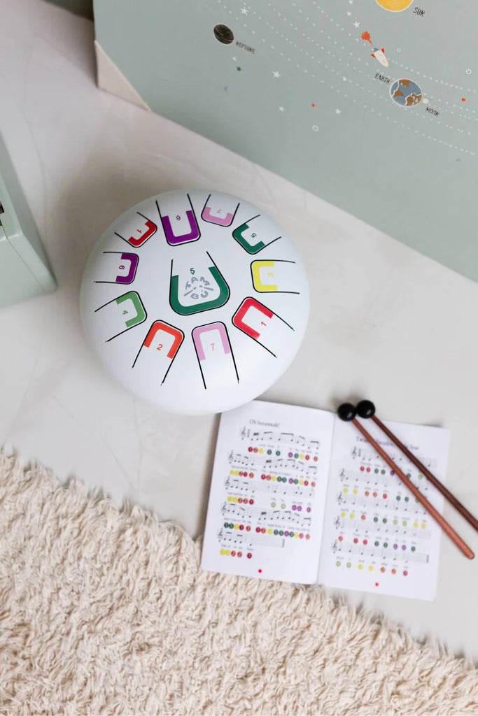 Tambú is an innovative tongue drum designed for all ages. It allows you to create harmonious melodies from the very first moment, with no prior musical knowledge required. Its colour and number coding system makes learning intuitive and fun.
