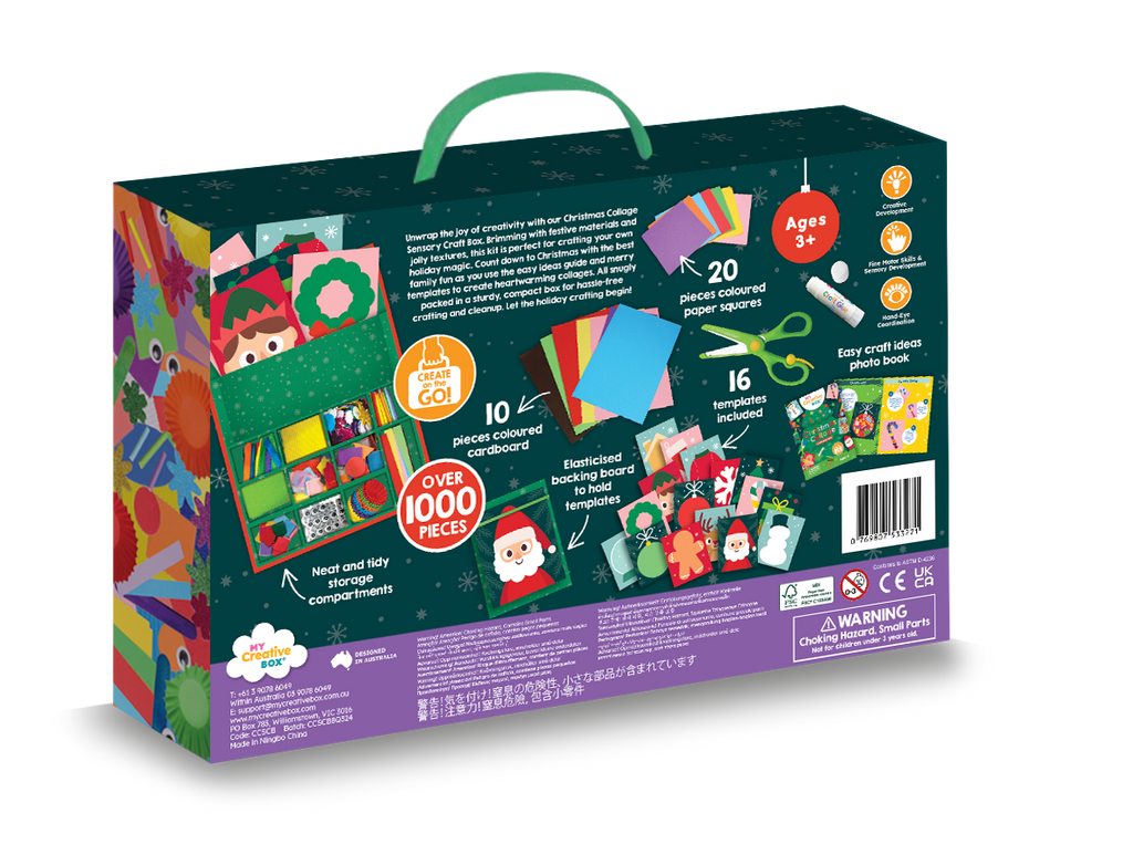 Unwrap the joy of creativity with our Christmas Collage Sensory Craft Box. Brimming with festive materials and jolly textures, this kit is perfect for crafting your own holiday magic. Countdown to Christmas with the best family fun as you use the easy ideas guide and merry templates to create heartwarming collages. All snugly packed in a sturdy, compact box for hassle-free crafting and cleanup. Let the holiday crafting begin! Unleash your child's imagination using the easy craft ideas book provided in the kit, or forge your own path to collage craft mastery.