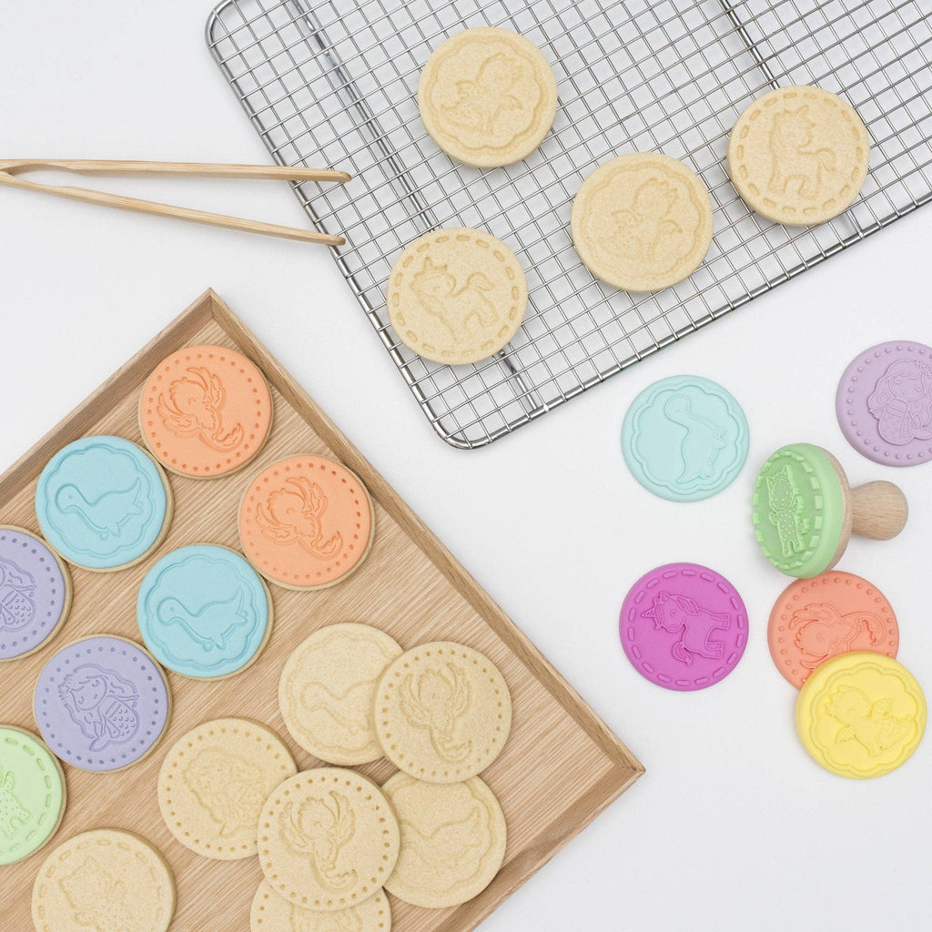 Every set of Mythical Stampies includes a stainless steel cookie cutter, wooden stamper and 6 easily interchangeable, food-grade silicone stamps featuring beloved mythical creatures.