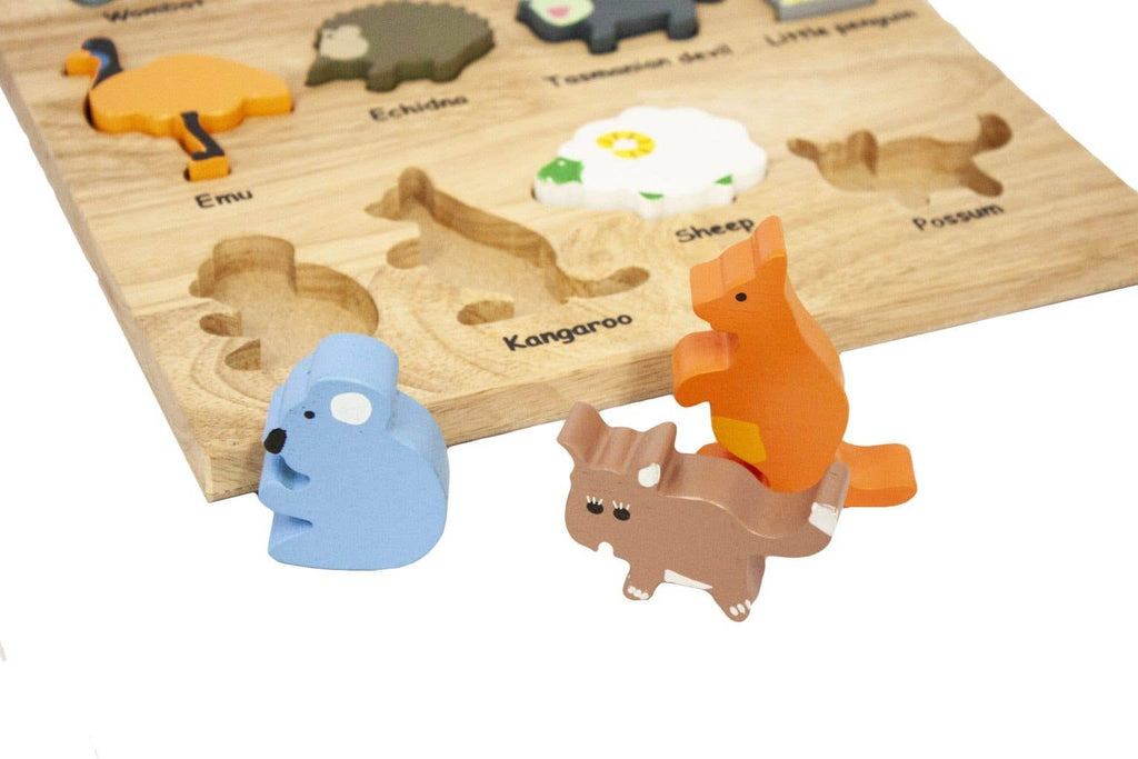 Similar to our wild animals puzzle, but this time featuring native Australian animals! Developed on the same concept with free standing Australian animals on a wooden board, this set can be a puzzle and a great animal play set. Suitable for under 3 years old. All Qtoys are made of plantation timber using non-toxic materials.
